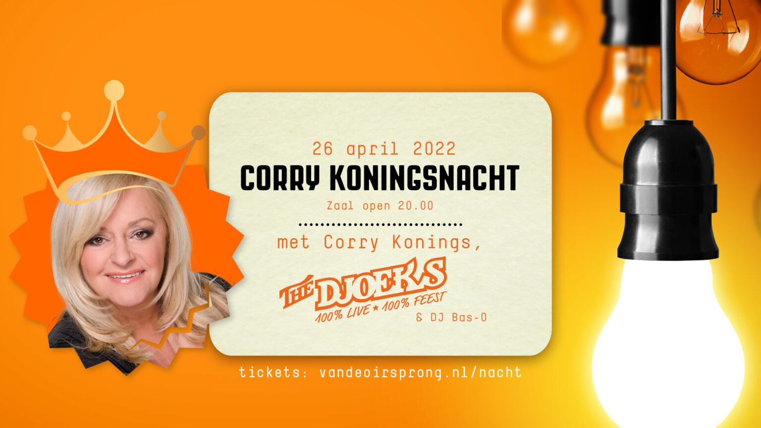 De Corry Koningsnacht Vandeoirsprong op 26 april 2022 met – niemand minder dan – Corry Konings, The Djoeks en DJ Bas-O. Kaartjes zijn verkrijgbaar via vandeoirsprong.nl/nacht. Kosten bedragen 15,- euro, voor de early birds hebben we de 100 eerste tickets beschikbaar voor 12,50, dus ben er op tijd bij! Maak je avondje uit compleet met een dinner show voorafgaand aan het feest (20 euro). We starten om 18u met een walking dinner met gezellig akoestisch optreden van The Djoeks!