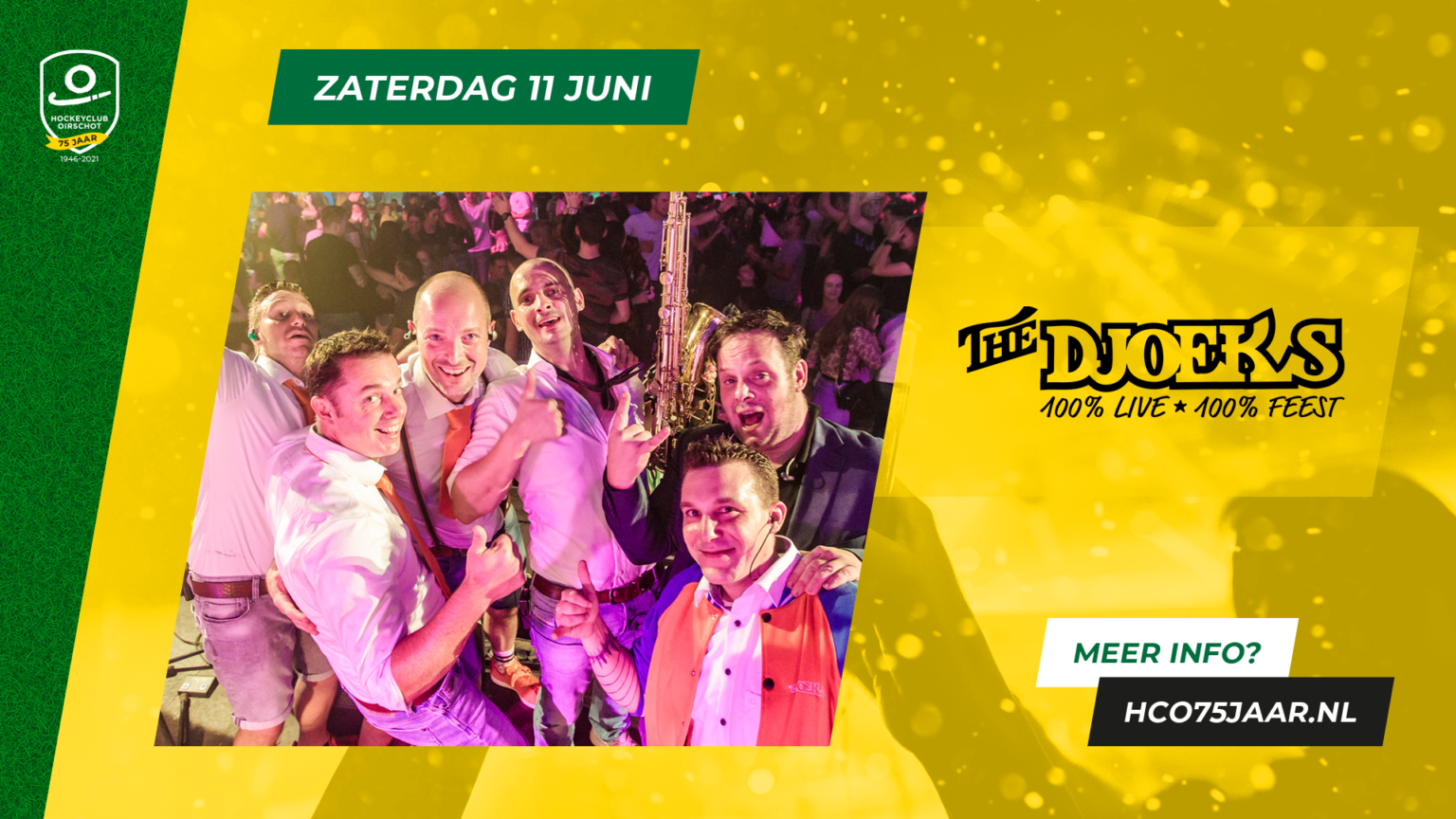 Zaterdagavond 11 juni is er ter gelegenheid van het 75-jarig bestaan van Hockeyclub Oirschot een feestavond. En raad eens wie daar het dak van de tent mag komen spelen? Natuurlijk The Djoeks! En iedereen is welkom om het jubileumfeest mee te vieren, de entree is gratis!